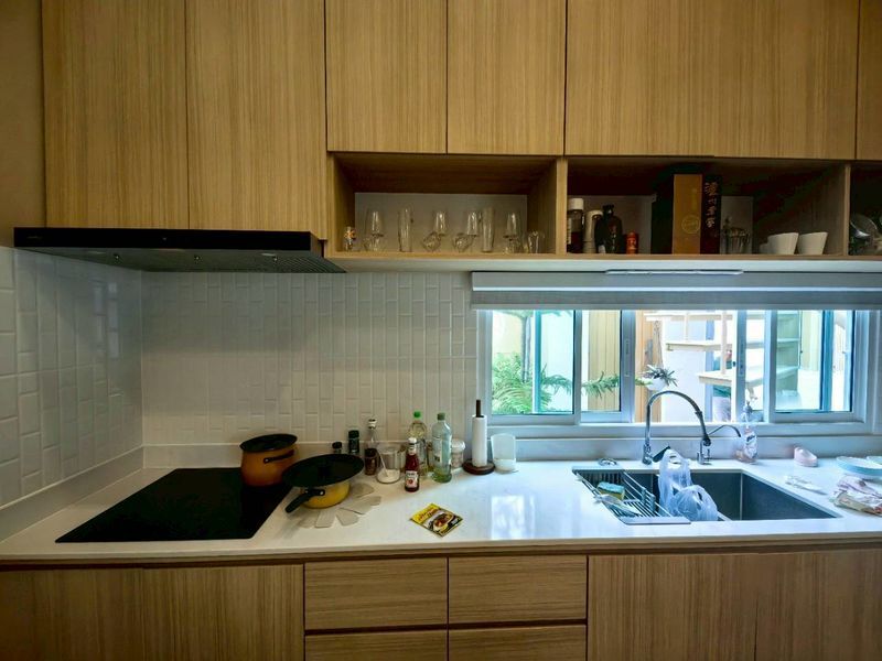 - ครัวบิวท์อิน พร้อมเตาไฟฟ้า ที่ดูดควัน ตู้เย็น ไมโครเวฟ