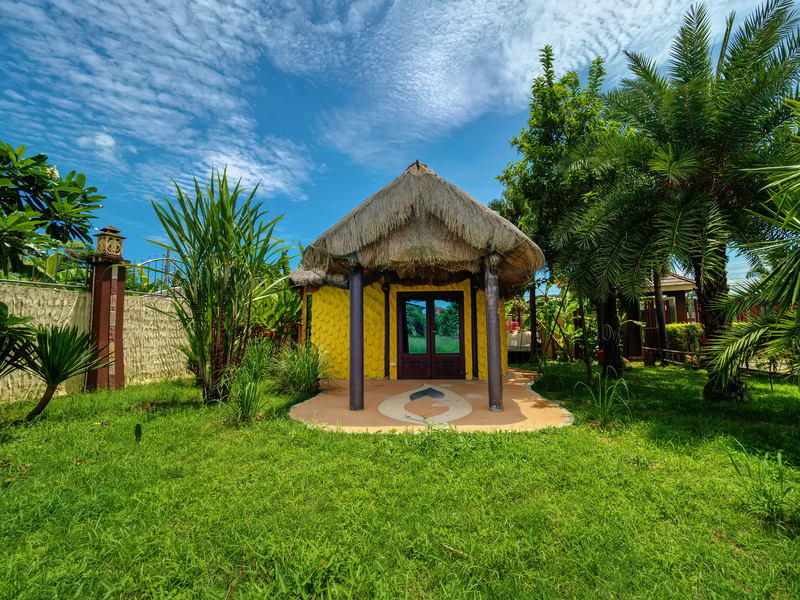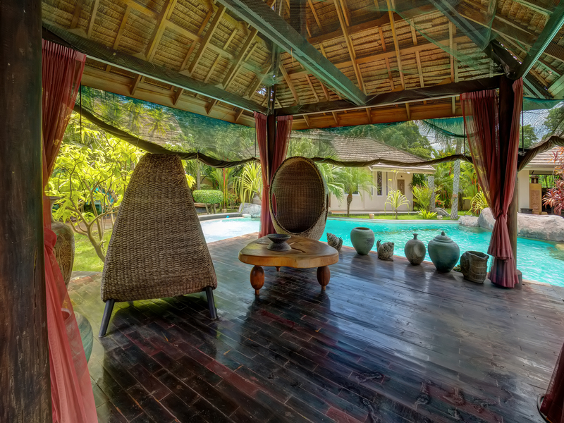 A beautifully crafted tropical-style pavilion with a thatched roof, perfect for relaxation, tea time, or open-air dining.