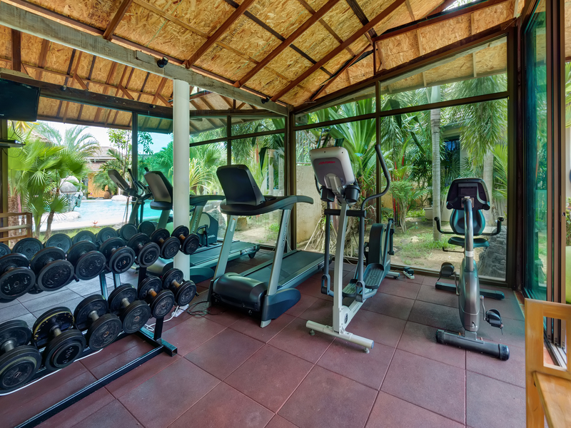 The fitness room features large floor-to-ceiling windows overlooking the garden and pool.