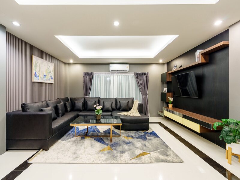 - Living Area: Spacious hall with large sofa and TV.